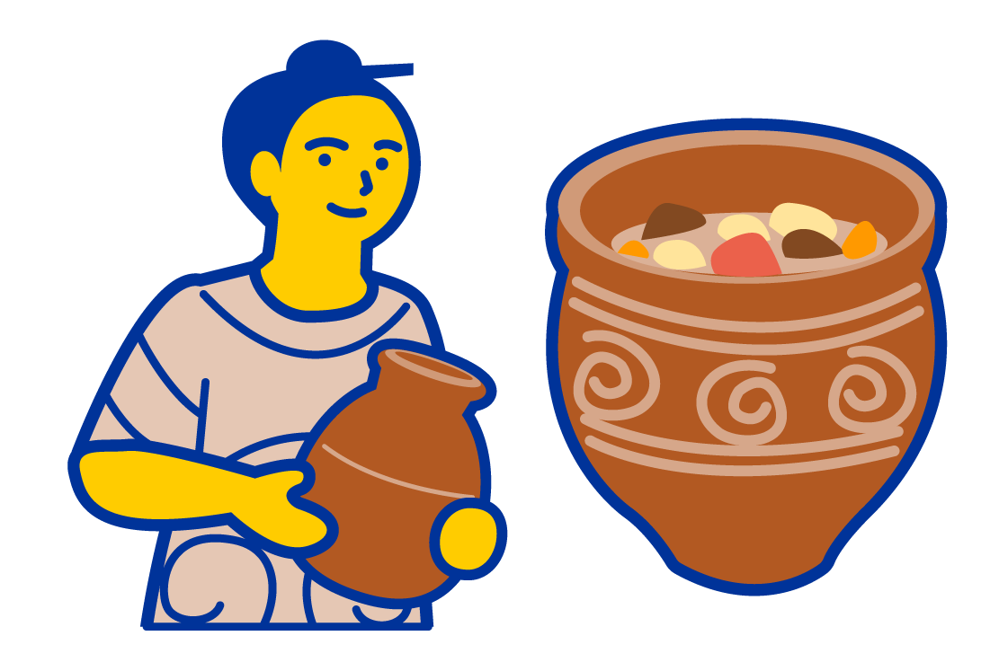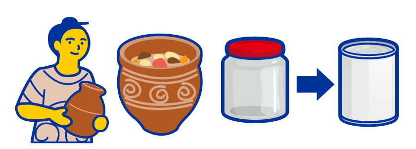 昔の人も、食べものを保存するために容器を使っていました。最初は木の葉や石を使っていましたが、その後「土器」という焼きものを発明しました。